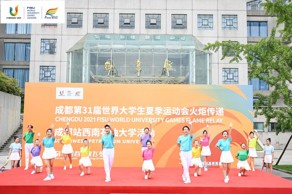 在成都大运会火炬传递主题曲《我们都是追梦人》和我校2023年招生宣传片原创主题曲《能源有你》的歌声中,成都第31届世界大学生夏季运动会火炬传递成都站(西南石油大学)起跑仪式在创业广场拉开帷幕。