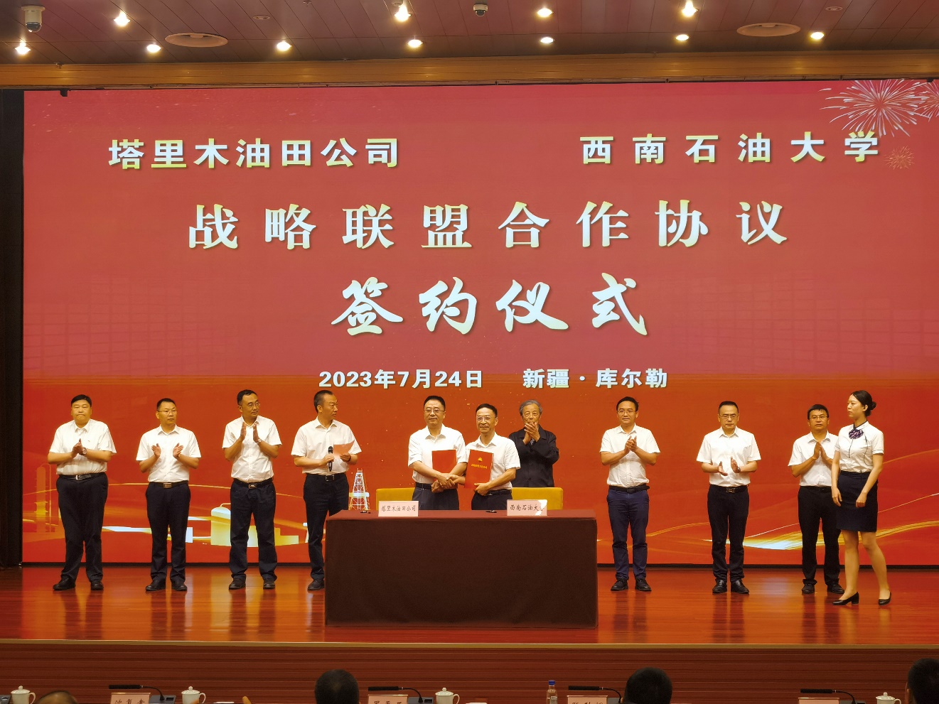 7月23-24日,校党委副书记、校长张烈辉,中国工程院院士罗平亚,校党委常委、副校长祝效华一行访问塔里木油田。塔里木油田公司执行董事、党工委书记沈复孝,总经理王清华等领导会见了张烈辉一行。双方就进一步深化校企合作进行深入交流,并举行了校企战略联盟合作协议签约仪式、中国石油超深油气勘探开发技术研发中心罗平亚院士联合创新团队揭牌仪式。沈复孝、张烈辉代表校企双方签约,罗平亚、沈复孝揭牌。仪式由塔里木油田公司党工委常委、副总经理、总工程师、安全总监胥志雄主持。