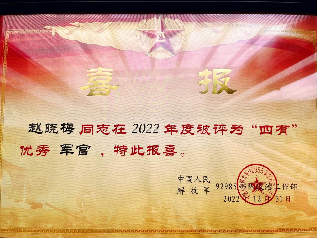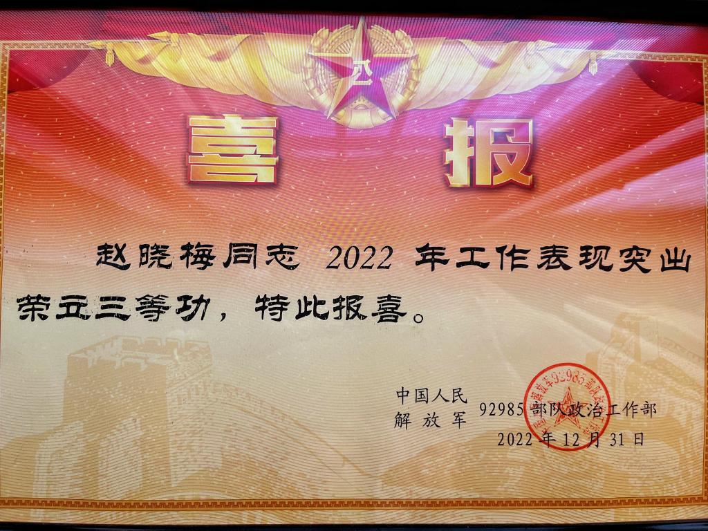 近日,学校武装部收到中国人民解放军某部发来的喜报,报告我校2017届应征入伍的毕业生赵晓梅荣立三等功、获得2022年度“四有”优秀军官。