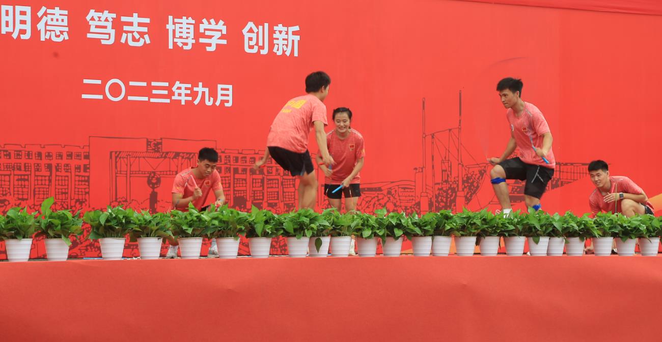 我校花样跳绳队为新同学带来别具一格的表演。花样跳绳运动是我校传统的特色运动项目,近两年,我校花样跳绳代表队共获得国家级奖项113项,省部级115项,在前不久我校进行的大运会火炬传递仪式上他们也奉献了精彩的表演。花样跳绳队精美的演出设计和高难度的动作展示博得了同学们一阵阵热烈的掌声。