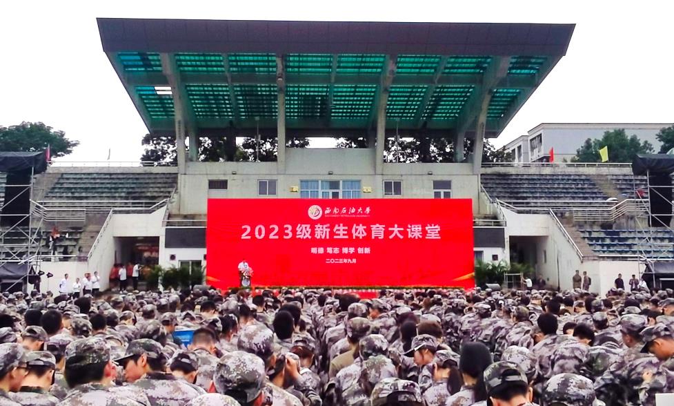 9月12日上午,6120名本科新生齐聚西南石油大学一期田径场,举行新生体育大课堂活动,共同聆听石大人的体育故事,了解石大体育文化和体育教学基本要求,体会“为祖国加油,为民族争气”的石大精神。体育学院党委书记彭小华、体育学院副院长(主持工作)向剑锋、体育学院副院长石金亮同青年体育教师代表、新生辅导员全程参加了大课堂活动。活动由向剑锋主持。