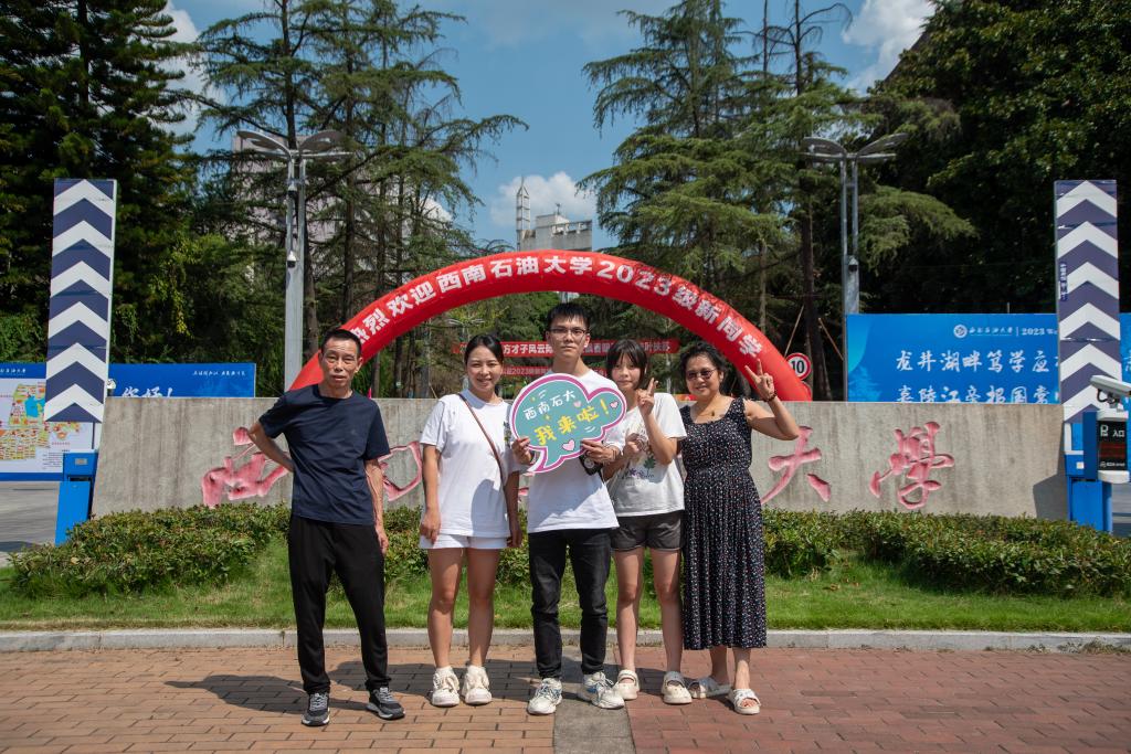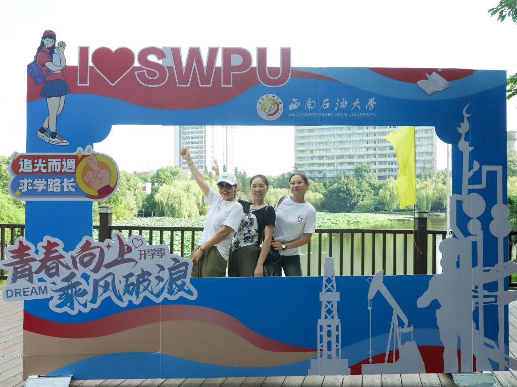 校区在西大门口摆放了创意拱门和迎新主题合影墙,在龙井湖观景平台、学生公寓等地均设置了创意打卡点。在打卡点前按下快门,记录下与西南石大的第一张照片,定格下“家”入西南石大的瞬间。
