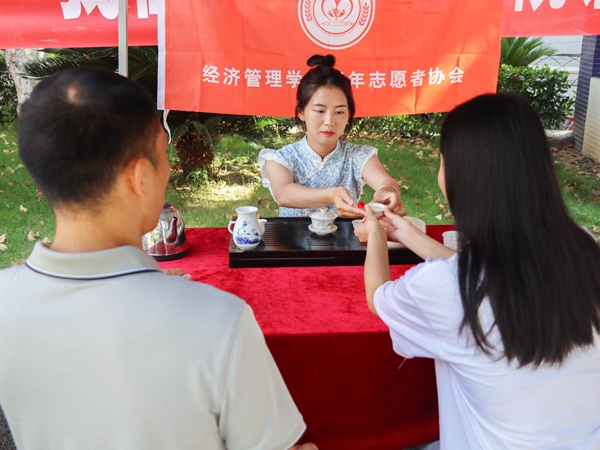 经济管理学院为新生及家长准备了多种防暑降温的茶饮,并现场进行茶艺表演,给新生及家长提供休憩的同时还带来了精神上的享受。