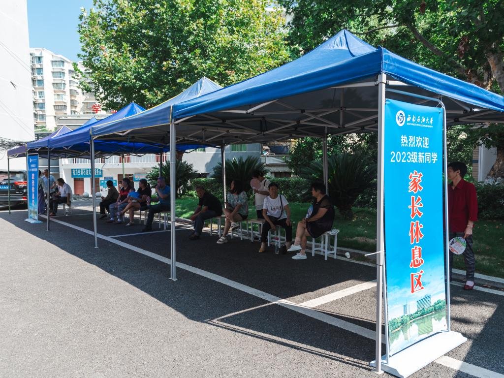校区在体育馆和国际学术交流中心设置了学生家长休息区,空调全天开放,学生志愿者轮班值守,提供贴心服务,报到期间,临时增加数顶帐篷,为新生及家长提供临时休息场地,并为其提供防暑降温服务。