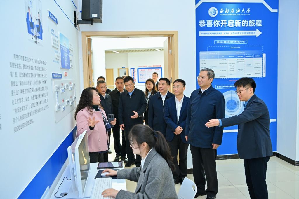 启动仪式结束后,熊四皓一行调研我校“就业育人”主题教育基地,了解我校党建引领促就业、优化服务促就业、创新举措促就业、聚焦育人促就业的具体举措,调研期间,对我校充分发挥能源领域学科优势和区位特色,构建具有西南石油大学特色的就业工作体系表示肯定。