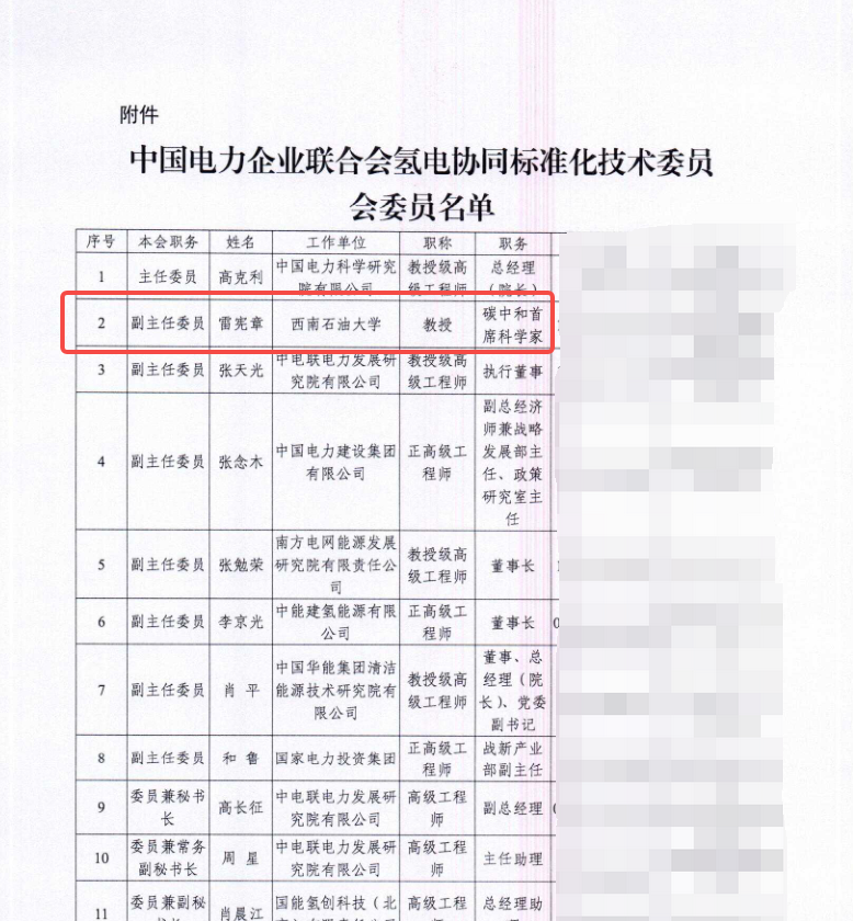 近日,中国电力企业联合会标准化管理中心公布第一届中国电力企业联合会氢电协同标准化技术委员会名单,德国工程院院士、我校碳中和首席科学家雷宪章任该委员会副主任委员。