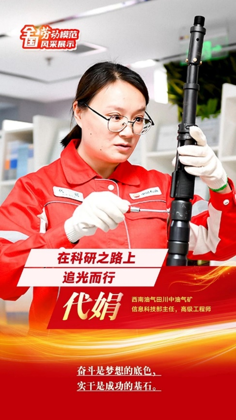 代娟,高级工程师,现任中国石油天然气股份有限公司西南油气田分公司川中油气矿信息科技部主任,荣获“全国五一巾帼标兵”等荣誉20余项。17年坚守奋战在油气科研一线,长期从事天然气勘探开发及井下工艺研究方面的科研工作,主持业务信息化研究项目,解决了西南油气田“三高”气井普遍存在环空带压现象和天然气处理厂内化工装置运行环境恶劣,现场操作员工难以及时发现设备异常等问题。本着“干一行、精一行”的认真负责态度,作为负责人和主研参与研发自主可控气田开采工具20项,年创经济效益1000余万元。