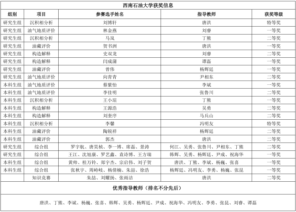 大赛由中国石油教育学会等5家单位主办,长江大学和中国石化江汉油田分公司承办。全国21所高校和科研院所的500余名本科生、研究生参加。大赛包括“全国油气地质技能大赛”“全国油气地质知识竞赛”“全国油气地质研究生学术论坛”三大板块,其中技能大赛设置地震资料构造解释、沉积相分析、石油地质综合评价及油藏评价四个方向,全面考察参赛选手的理论知识、实践能力、创新思维和团队协作精神。最终产生综合组特等奖5项、一等奖13项、二等奖27项,以及单项组各类奖项。