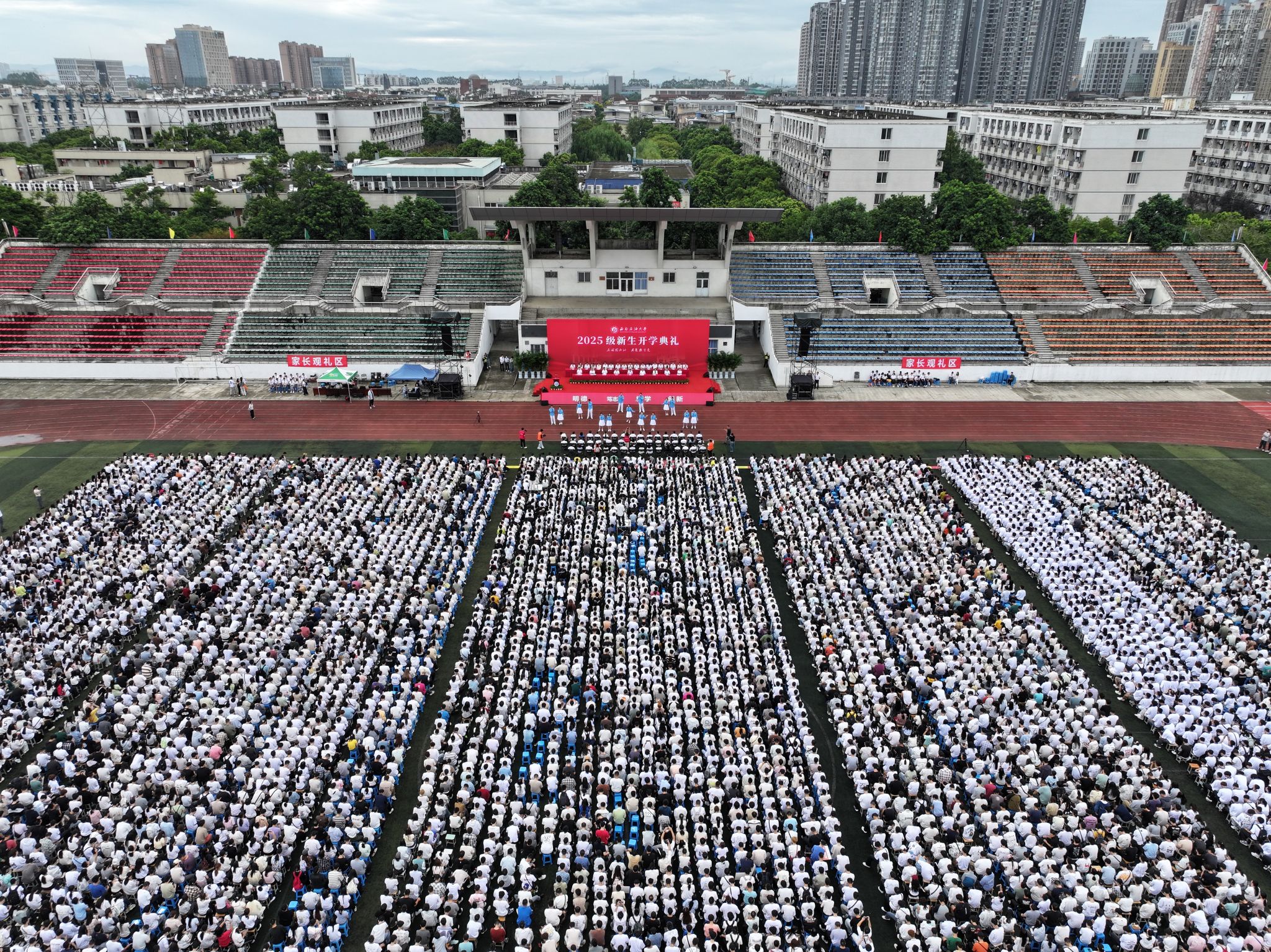 2025级全体新生,各学院党委书记、院长、党委副书记,机关和直属单位主要负责人,新生辅导员,教师代表、高年级学生代表参加了典礼。