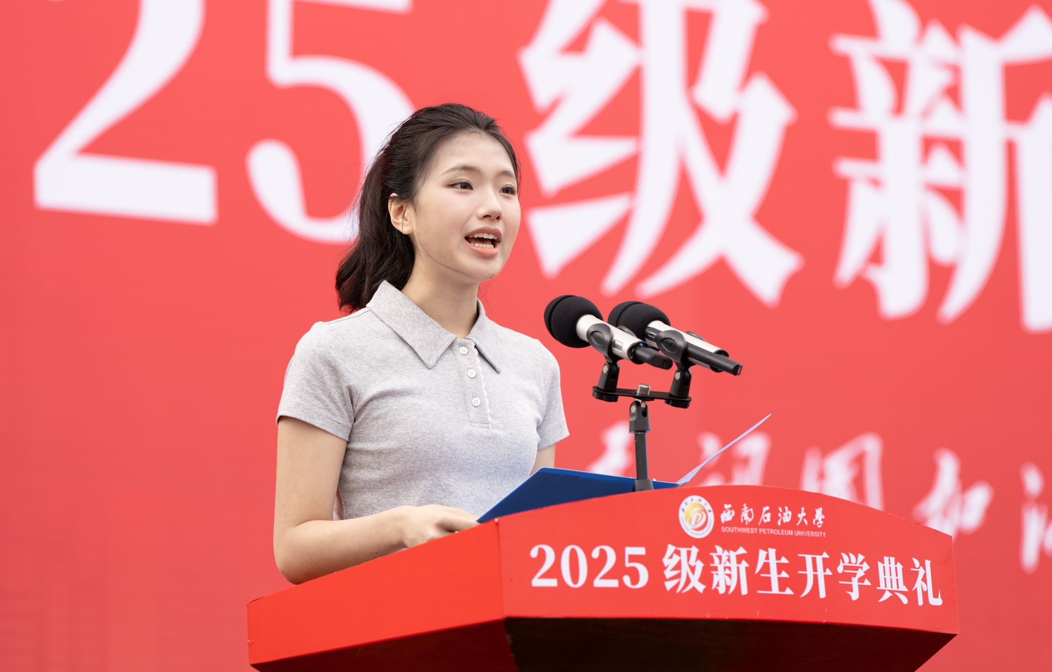 作为石大“新”人,艺术学院播音与主持艺术专业大一新生杨欣莹讲述了与石大结缘的故事,三代军人的红色基因让她坚定了用声音讲好中国故事的决心,她呼吁同学们铭记历史、锤炼本领,勇担报国使命;电信院控制科学与工程专业2025级硕士研究生王欢讲述了自己从大一到研一,与石大相伴成长的故事,他用“不断尝试”“练就本领”“直面挑战”三个方面的思考与同学们共勉,共同奔赴新的“赶考”路。