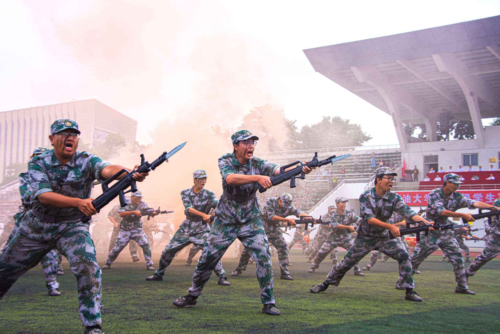 半个月的军训成果在现场集中展现——举字方阵、军体拳方阵、刺杀操方阵、匕首术方阵等依次入场,拳风虎啸,气势如虹,动作行云流水,口号声如惊雷炸响,赢得全场热烈掌声。
