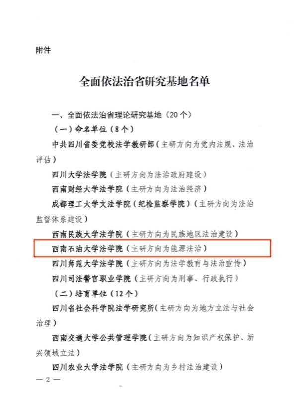 四川省第一批全面依法治省研究基地包括20个理论研究基地(命名单位8个、培育单位12个)和21个实践研究基地(命名单位11个、培育单位10个)。我校法学院入选全面依法治省理论研究基地命名单位(主研方向为能源法治)。