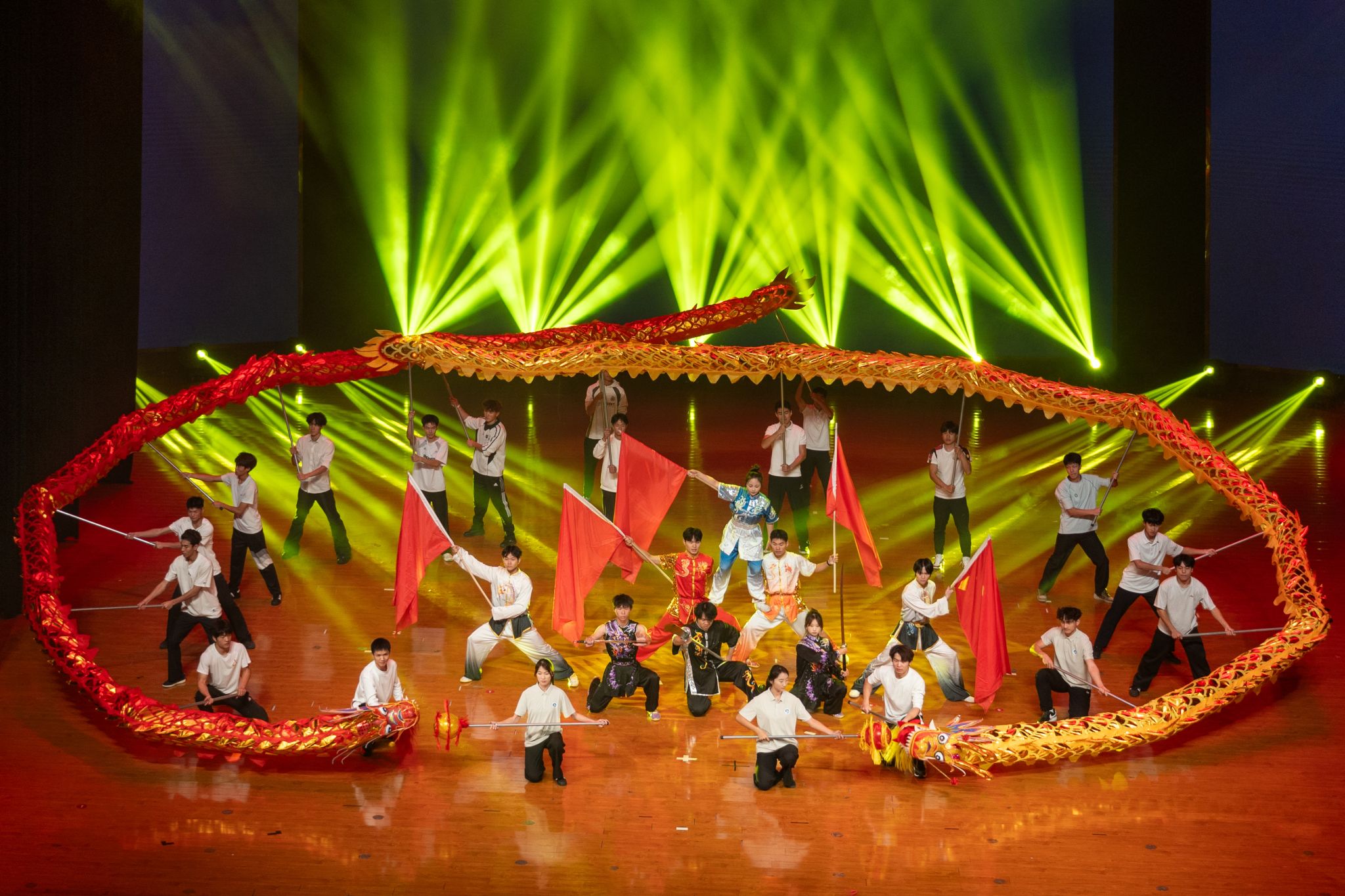 民乐表演《华夏》奏响了中华文化的深厚底蕴与时代强音,歌曲《新的心跳》唱出了新一代石大学子对未来的无限憧憬与勇毅前行的决心,歌舞《保卫玉门》演绎着一代代石油人的坚守和奉献,传承着艰苦奋斗的精神,杂技《穹顶之羽》生动诠释了石大人不畏艰险、勇攀高峰的精神风貌,舞蹈《东方茉莉》勾勒出一幅清雅脱俗的东方画卷,非遗展示《少年强则国强》将传统技艺与青春力量完美融合,展现出文化传承中的青年担当。