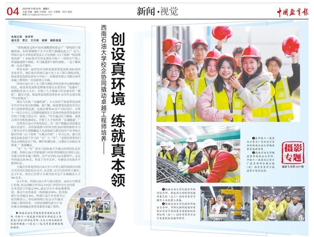学校第三次党代会召开在即,12月24日,中国教育报以《西南石油大学校企协同撬动卓越工程师培养——创设真环境 练就真本领》为题,报道我校校企协同培养卓越工程师的火热实践。报道突出紧扣办学经验亮点、发展成效,展现了学校蓬勃发展态势,凝聚力量鼓舞人心,为学校第三次党代会献礼。