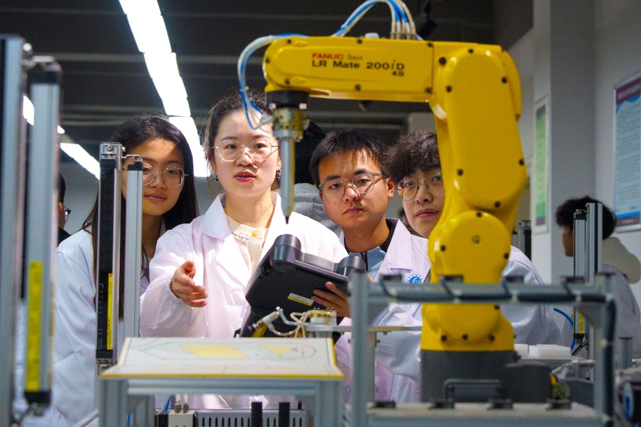 西南石油大学九微合作班学校导师、新能源与材料学院教师曹艺轩(左二)指导学员学习操作工业机器人设备。
